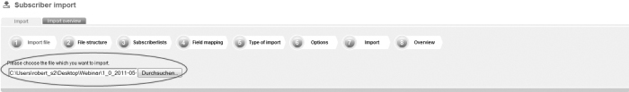 Save the file as a file with the feature 'CSV (Comma delimited)'. Apple user: If you own an apple computer, you will have to safe the file as 'CSV-Windows'. INOMAIL does not run files in the Mac format. Step 1 – Import fileOn the navigation bar click on 'Subscribers' and then go to the navigation subitem 'Import'. This is the way how you get to the menu-guided import function of INOMAIL. First, you will have to choose the file which you want to import; |