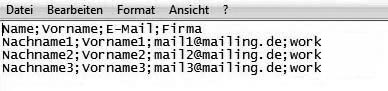 Maybe you have already collected email addresses to which you want to send a newsletter. No matter in which database these information are stored – you only need to save them in a CSV file (for example with Excel) and import them INOMAIL. You can pack your CSV file as a zip to accelerate the uploading of large files. That's how it works:In the first line of the table, there should be field names – first name, surname, email address etc. An example: |