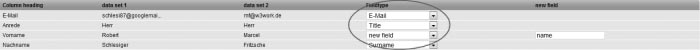 if the first line of your address file contains (as shown in the example above) the column headings, leave the item 'First line contains column headings' marked . Otherwise, if your address file starts right away with the subscriber data, unmark this option. Step 3 – Subscriber ListsChoose the subscriber list to which you want to import the addresses. Subsequently click on 'Next'. Step 4 – Field MappingNow you are asked to match the field names of your subscriber data with those of INOMAIL. In order to do so, please choose in the drop down menus the associations which correspond to field information displayed to the left of these menus. If there does not exist a matching subscriber field, choose 'New Field' and enter a name for the subscriber field that needs to be created. Click 'Next'.