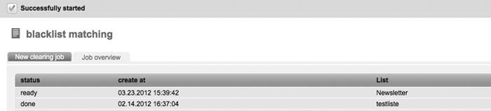 | You will find information on the blacklist and its function in 2.11 Blacklist. Via the function 'Blacklist matching', you can coordinate the data records of your subscriber lists with the entries in your blacklist. Detected subscribers will automatically be deleted by INOMAIL. First, you have got to choose the subscriber list which has to be examined. By clicking the 'OK' button, you will confirm the appearing message to delete the search results. The result will show you how many subscribers were removed due to the fact that they are registered in the blacklist. |