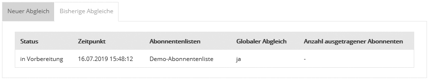 Daraufhin startet INOMAIL den Abgleich. Im Reiter 'bisherige Abgleiche' können Sie den Status des Fortschrittes einsehen. Nach Fertigstellung wird Ihnen die Anzahl der ausgetragenen Abonnenten angezeigt. |
