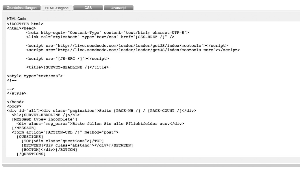Insert your entire html source code. By creating a new template, INOMAIL generates a sample html source code with all important survey-placeholders automatically in this tab.