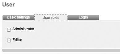Enter the right of your user in tab 'user roles'. Examples for 'user roles' are 'Administrator' and 'Redakteur'. If you determined further 'user roles' or edited an 'user role' you can chose them here. |