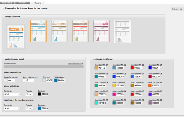 Now you also can adjust the design of your report. Choose the tab 'designs'. By default INOMAIL suggests you six different layouts. HTML experts can also open the 'advanced settings' below the layouts to edit the html-code. For example you can insert your logo in th header.