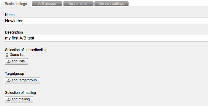 Select one or more 'subscriberlists' and optionally a target group, which is the basic of your A/B test. Furthermore you need a mailing, which you have created within the E-Mail office as a standard mail. Keep attention that you already set up all adjustments like sender adress, reply adress etc in your mailing.