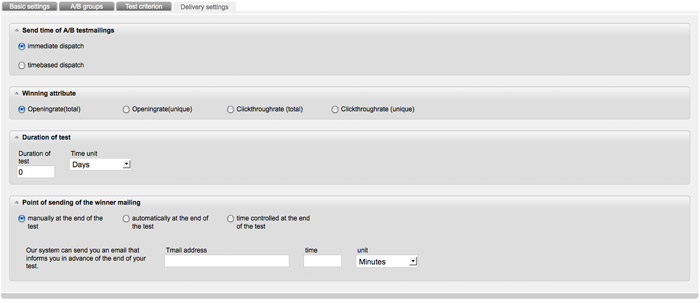 In the last tab you define the settings for the dispatch. Determine by which criterion (opening-rate or click-through-rate) INOMAIL should identify the winner. Equally important is to determine the duration of the test.