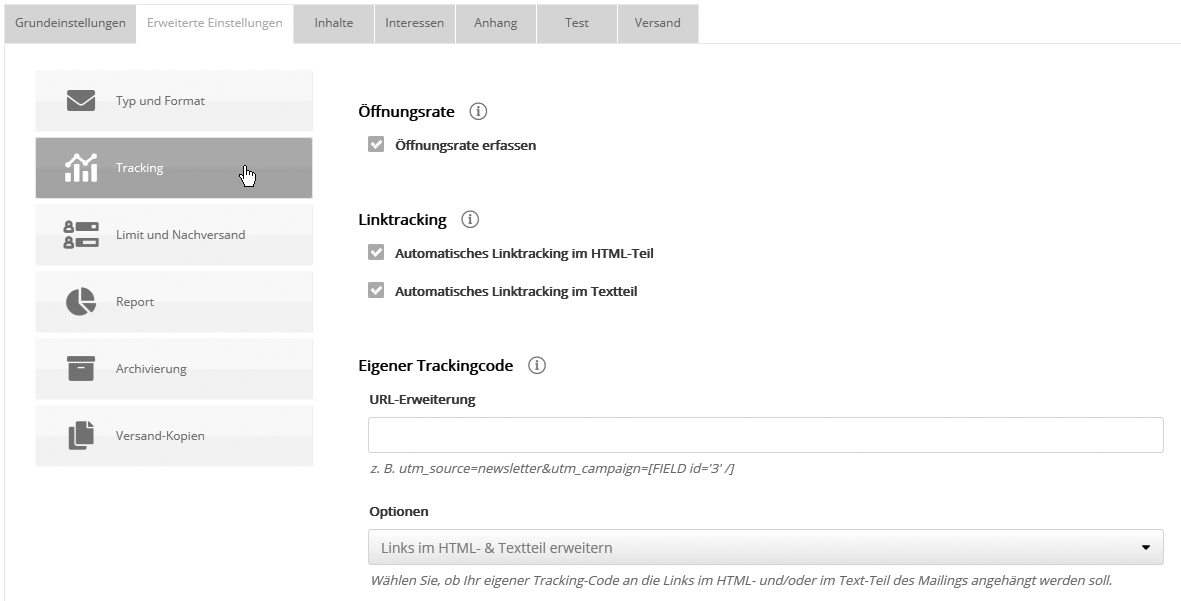 ÖffnungsrateUm nach dem Versand auszuwerten, wieviel Prozent der Empfänger das Mailing geöffnet haben (siehe 'Übersicht, Öffnungs-/Klickrate'), muss die Option 'Öffnungsrate erfassen' aktiviert sein. Dazu integriert INOMAIL im HTML-Teil des Mailings ein unsichtbares Zählpixel, welches für jeden Empfänger individuell verlinkt ist und dessen Aufruf als Öffnung gezählt wird. Die Messung funktioniert unabhängig von der Mailing-Einstellung 'Inboundimages', solange der Empfänger die Anzeige von Bildern in seinem Posteingang nicht unterdrückt. Hinweis: Ist die Erfassung der Öffnungsrate deaktiviert, aber die nachfolgende Option "Linktracking" aktiviert, dann werden Klicks automatisch auch als Öffnung gewertet. Die Öffnungsrate erfasst in dem Fall nur den Teil der Öffner, der irgendeinen Link angeklickt hat. LinktrackingAktivieren Sie Automatisches Linktracking im HTML-Teil, so wird jeder im Mailing enthaltene Link durch einen Tracking-Link ersetzt, der für jeden Abonnenten individualisiert ist. Diese Tracking-Links werden über den INOMAIL-Server auf die ursprüngliche Link-URL umgeleitet und dabei gezählt. Damit können Sie nach Versand des Mailings sehen, wie oft jeder Link angeklickt wurde (siehe 'Übersicht, Öffnungs-/Klickrate'). Weiterhin lassen sich darauf basierend Zielgruppen bilden, z. B. "Alle, die Link B angeklickt haben" können erneut mit weiteren Informationen angeschrieben werden. Bitte beachten Sie, dass Sie jede URL vorher als Link definieren müssen. Sie können die Richtigkeit der Tracking-Links überprüfen, indem Sie sich ein Testmailing zusenden. Eigener Tracking-CodeHier ist es möglich, alle Links des Mailings automatisch um eigene Parameter zu erweitern. Damit lässt sich das weitere Verhalten der Newsletterempfänger per Website-Analyse-Tools wie z.B. Google Analytics, Piwik oder econda tracken. Kopieren Sie dazu den Tracking Code Ihres Tools in das Feld, damit INOMAIL ihn automatisch an alle externen Links Ihres Mailings anhängt. Folgende Parameter werden unterstützt: