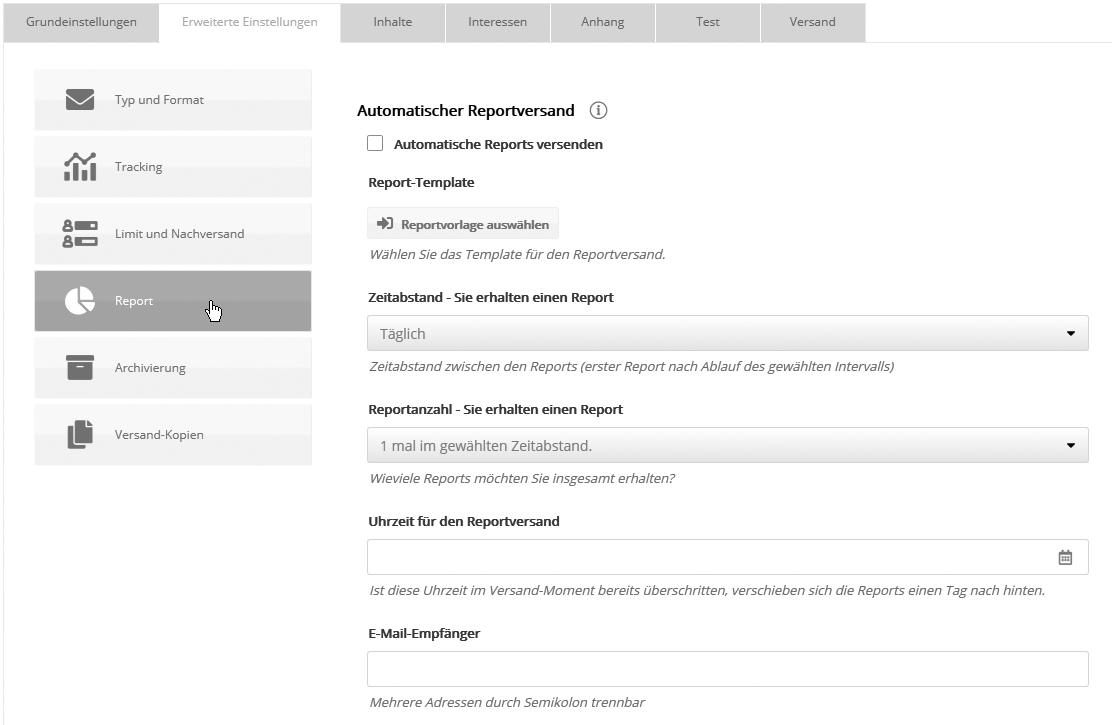 KontaktfrequenzDie Wirkung der beiden Kontaktfrequenz-Optionen ist im Abschnitt 'Individuelle Einstellung pro Mailing' als Teil des Themas 'Kontaktfrequenz' detailiert beschrieben. Die Optionen sind an dieser Stelle nur dann wirksam, wenn im zentralen Menü 'Administration' --> 'Kontaktfrequenz' die Kontaktfrequenz-Prüfung aktiviert ist. Nachversand an NeuanmelderAuf Wunsch versenden Sie das aktuelle Mailing automatisch an jeden neuen Abonnenten, der sich über das hier gewählte Anmeldesetup anmeldet. Sobald Sie das Mailing versenden, wird es am Anmeldesetup zum Nachversand eingetragen. Diese Zuordnung bleibt erhalten, bis sie erneut ein Mailing mit aktivierter Nachversand-Option versenden, oder am Anmeldesetup ein anderes Mailing wählen. Eine ausführliche Beschreibung der Nachversand-Optionen finden Sie im Artikel zum Anmeldesetup. Erweiterte Einstellungen: Report