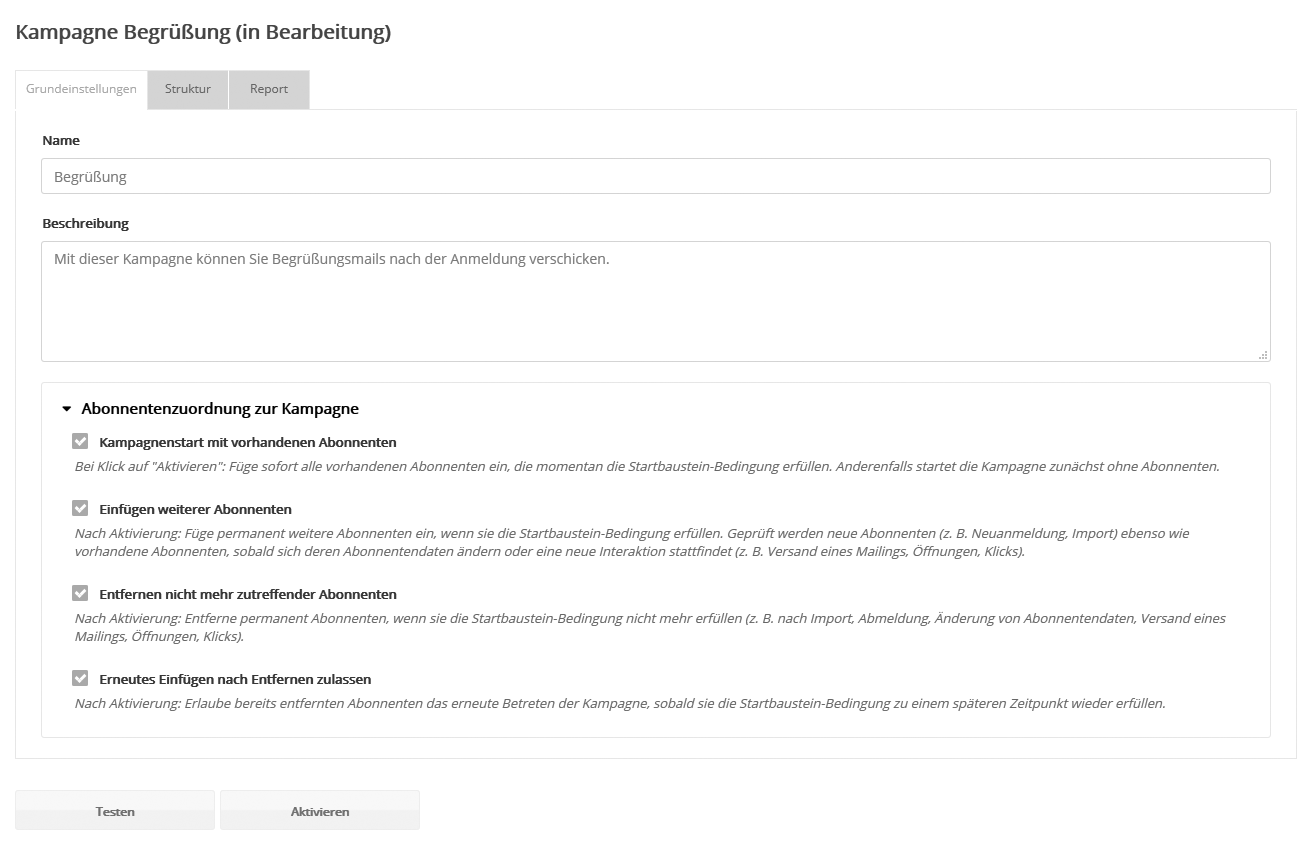 Kampagnen sind ein mächtiges Werkzeug. Vor dem Einsatz mit echten Abonnentendaten sollte jede Kampagne ausführlich getestet werden.