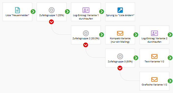 Den Ablauf setzen Sie aus Bausteinen zusammen. Mit Hilfe aller zur Verfügungen stehenden Zielgruppentypen legen Sie fest, wann welcher Abonnent wohin verzweigen soll.