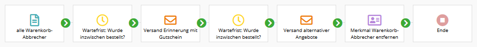 - Die anderen Abonnenten erhalten im nächsten Schritt ein Mailing, das an die "vergessenen" Warenkorb-Artikel erinnert. Für einen zusätzlichen Kaufanreiz kann dabei z.B. ein Gutschein sorgen, der in dem Mailing enthalten ist.