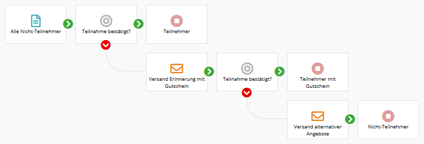 - Alle übrigen Kampagnen-Teilnehmer erhalten nun eine Infomail, die ihnen verschiedene weitere Veranstaltungen näher bringen soll. Sie sind anschließend im Endebaustein 'Nicht-Besteller' zu finden.