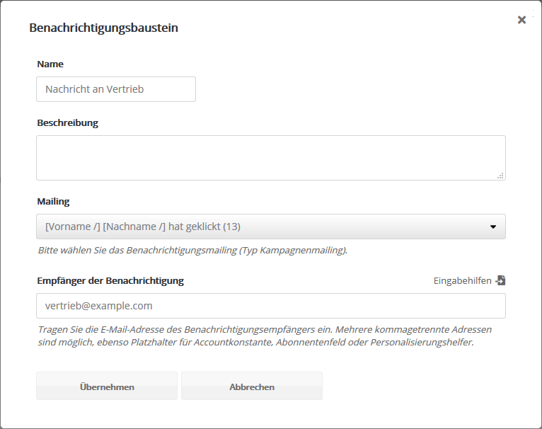 Der Benachrichtigungsbaustein versendet ein Mailing an die im Baustein eingetragene E-Mail-Adresse. Im Unterschied zum Versandbaustein erhält die Mail nicht der Abonnent selbst, sondern beispielsweise Ihr Vertriebsmitarbeiter. So lässt sich sofort eine Benachrichtigung senden, sobald ein wichtiger Empfänger eine Schlüsselstelle der Kampagne erreicht.