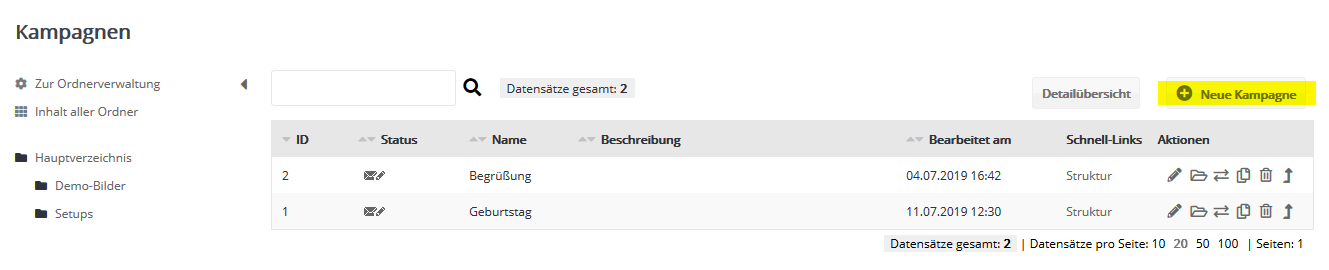 Kampagnen lassen sich über die rechts befindlichen Symbole öffnen, bearbeiten und löschen oder in einen anderen Ordner kopieren bzw. verschieben. Per Klick auf das 'Ordner öffnen' -Symbol wechseln Sie in den aktuellen Ordner, der die Kampagne enthält.