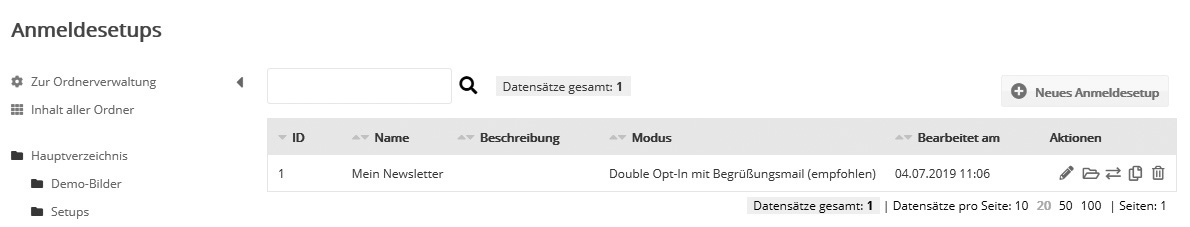 Setups: AnmeldesetupIm Menü 'Anmeldesetup' erstellen Sie Anmeldeformulare zur Einbindung auf Ihrer Website. Die Felder ordnen Sie per Drag&Drop an. Den Formular-Quellcode für Ihre Website erzeugt INOMAIL automatisch. Zum schnellen Einstieg enthält INOMAIL ein Demo-Anmeldesetup. Die vorhandene Setups lassen sich über die Symbole'Bearbeiten', in Unterordner 'Verschieben' oder 'Kopieren' und über das Papierkorb-Symbol 'Löschen'.