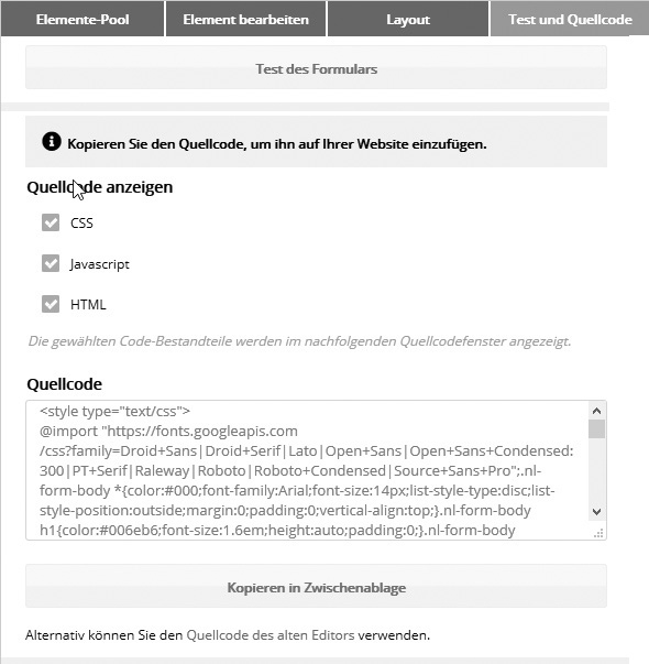 Tab #4: Test und Quellcode Bevor Sie den Formular-Quellcode in Ihre Website einbinden, testen Sie bitte den Anmeldevorgang über den Button 'Test des Formulars'. Es findet eine reale Anmeldung statt, d. h. Sie testen nicht nur die Optik und Bedienung des Formulars, sondern auch die korrekte Übergabe der Daten. Ist die Fehlermeldung bei nicht ausgefüllten Pflichtfeldern hilfreich? Werden die korrekten Dialogmails verschickt? Klappt die Bestätigung des Double Opt-In? Erscheinen die eingestellten Dialogseiten? Wurde der neue Abonnent in der gewünschten Liste eingefügt? Wurden alle Eingaben in die Felder übernommen?